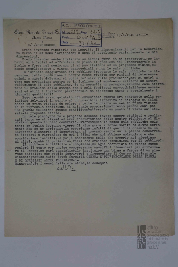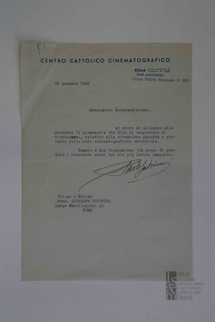 Lettera di Romolo Coacci della Direzione generale dell'ACI al Centro cattolico cinematografico - CCC