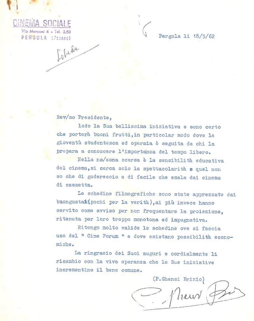 Lettera di padre Brizio Ghensi, responsabile del cinema sociale di Pergola in provincia di Pesaro, a mons. Francesco Dalla Zuanna, presidente dell'ACEC
