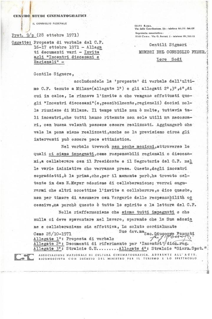 Consiglio federale del Centro sudi cinematografici - CSC. Proposta di verbale della riunione del 16-17 ottobre 1971, documentazione varia e invito agli incontri regionali diocesani
