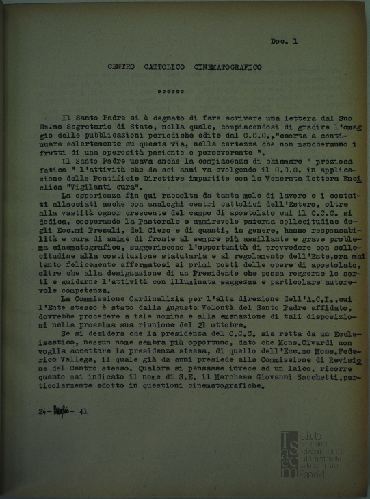 Relazione di Paolo Salviucci sulle attività del Centro cattolico cinematografico - CCC