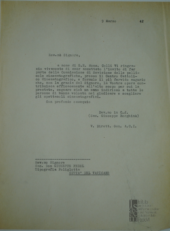 Lettera di mons. Giuseppe Borghino, vice direttore generale dell'ACI, a padre Giuseppe Fedel della Tipografia Poliglotta della Città del Vaticano
