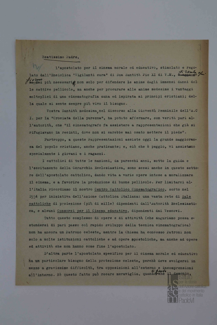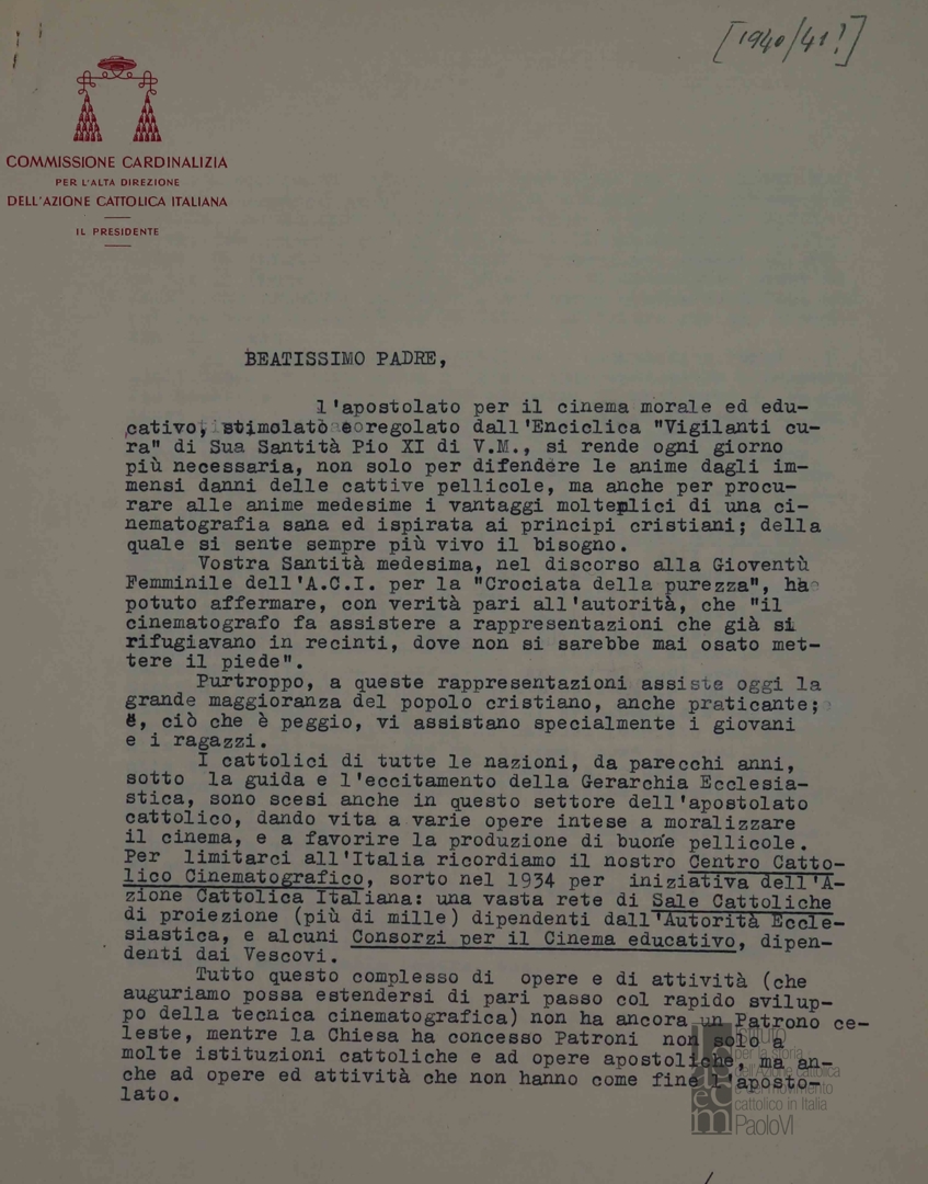 Lettera di mons. Luigi Lavitrano, presidente della Commissione cardinalizia per l'Alta direzione dell'Azione cattolica italiana, al pontefice papa Pio XII