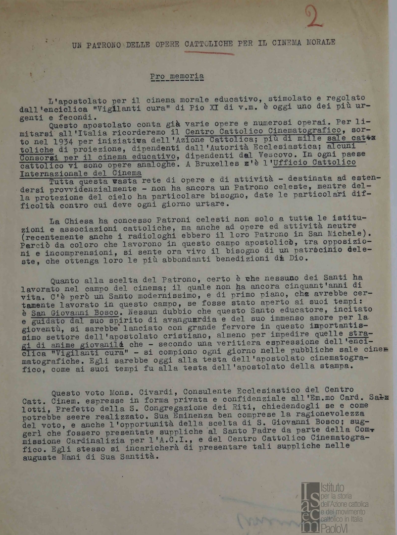 "Un patrono delle opere cattoliche per il cinema morale. Pro memoria"