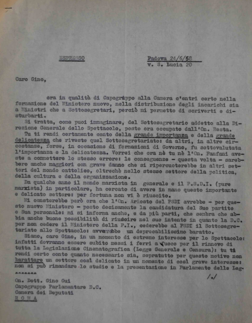 Lettera di mons. Francesco Dalla Zuanna a Luigi Gui, capogruppo parlamentare della Democrazia cristiana