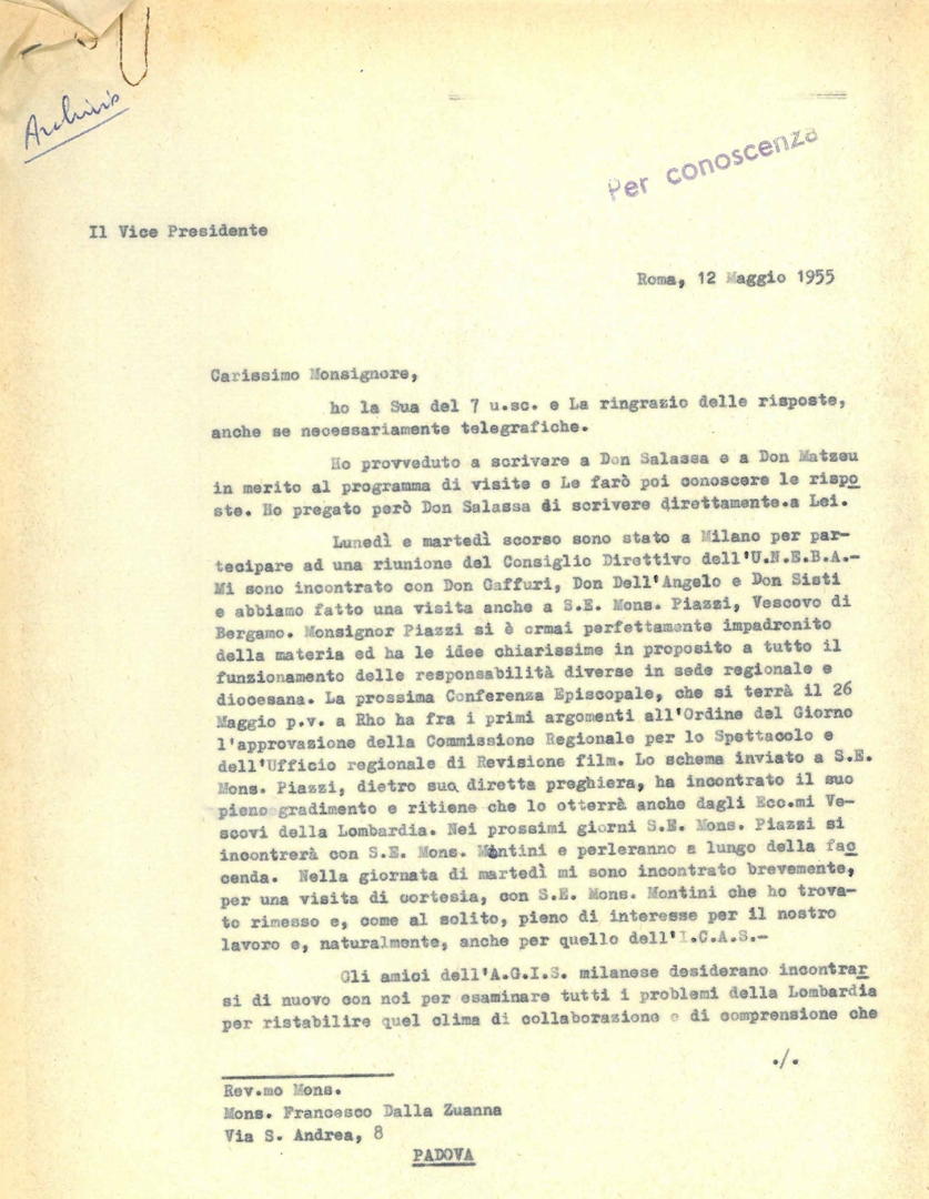 Lettera di don Francesco Angelicchio, consulente ecclesiastico dell'Ente dello spettacolo, a mons. Francesco Dalla Zuanna, presidente dell'ACEC
