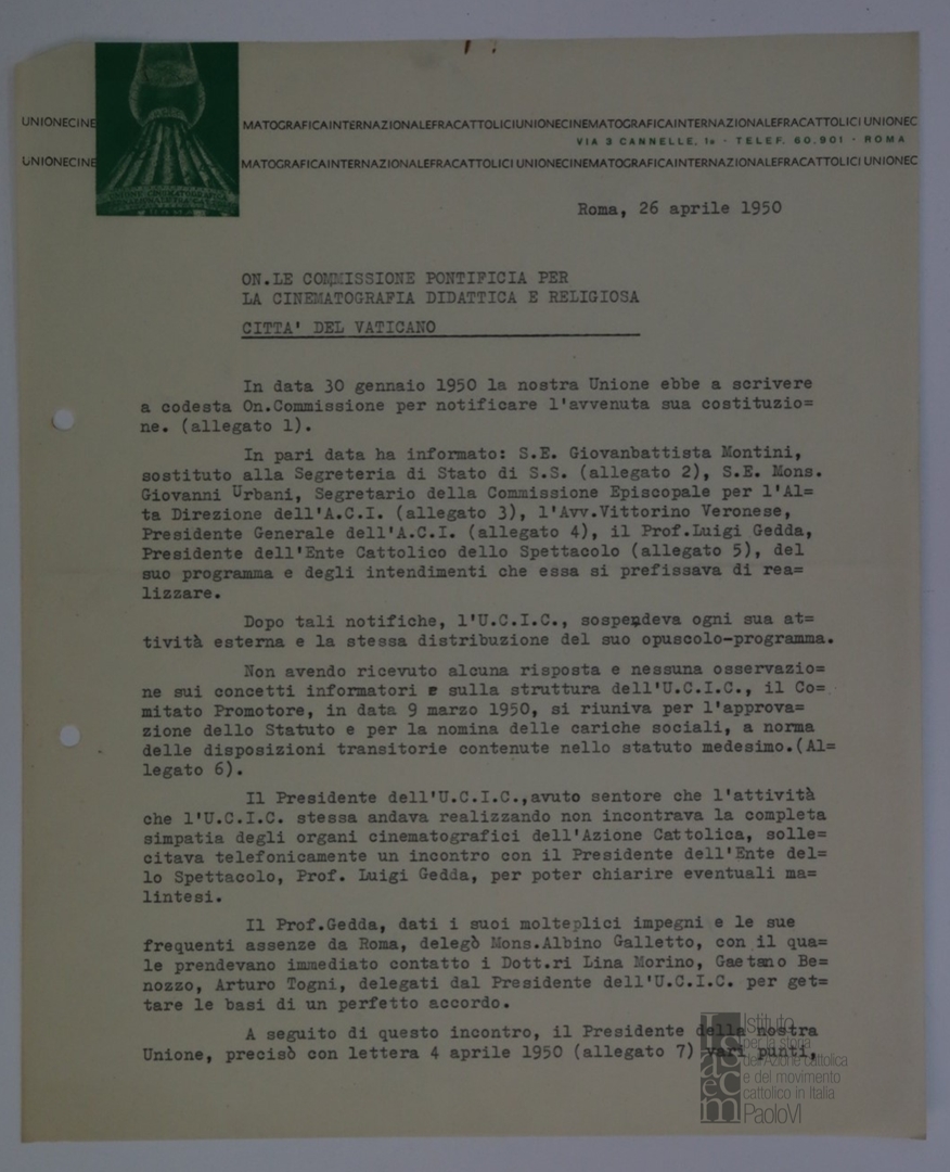 Lettera della Segreteria generale dell'Unione cinematografica internazionale fra cattolici - UCIC, a firma di Gaetano Benozzo e di Arturo Togni, indirizzata alla Pontificia Commissione per la cinematografia didattica e religiosa