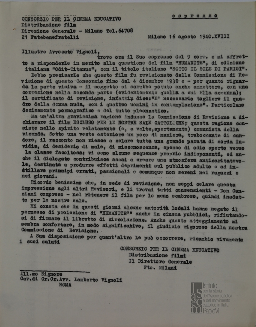 Lettera di Mario Milani, direttore del Consorzio per il cinema educativo, a Lamberto Vignoli, presidente del del Centro cattolico cinematografico - CCC