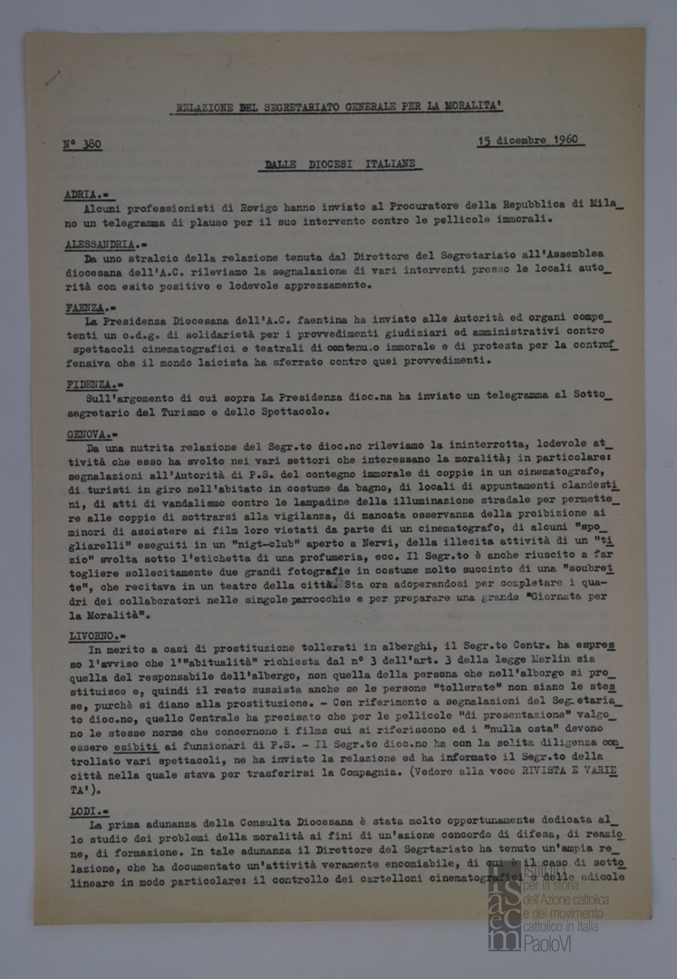 "Relazione del Segretariato Generale per la Moralità. Nr. 380"