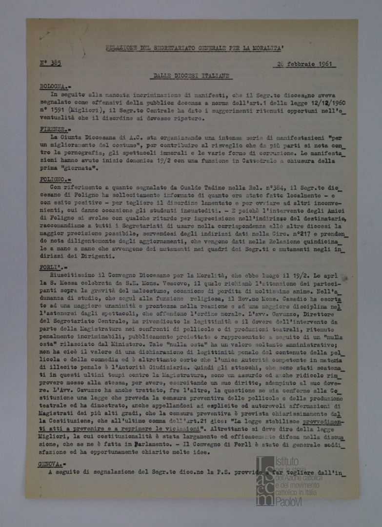 "Relazione del Segretariato Generale per la Moralità. Nr. 385"