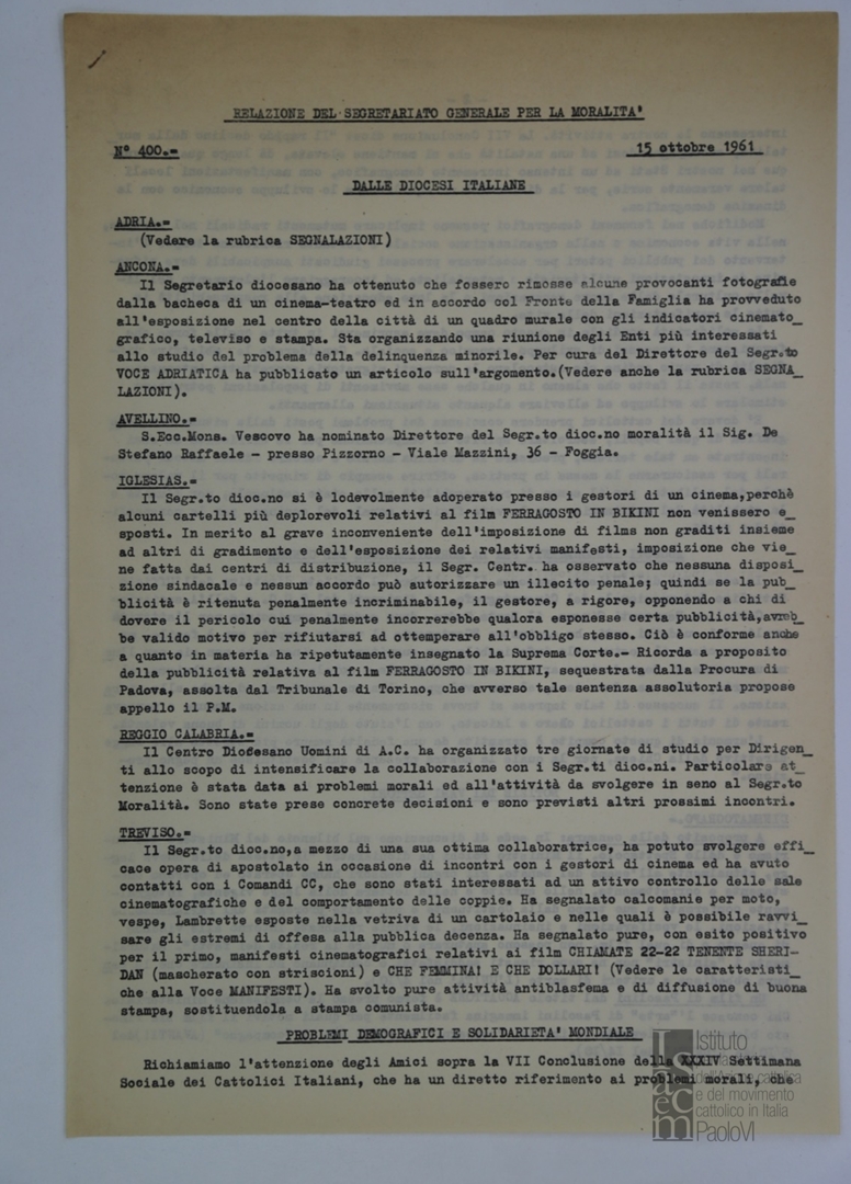 "Relazione del Segretariato Generale per la Moralità. Nr. 400"
