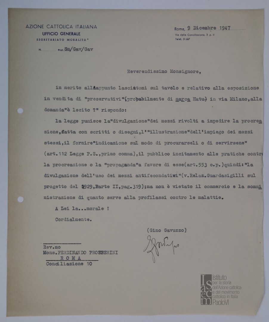 Lettera di Gino Gavuzzo, del Segretariato centrale della moralità, a mons. Ferdinando Prosperini