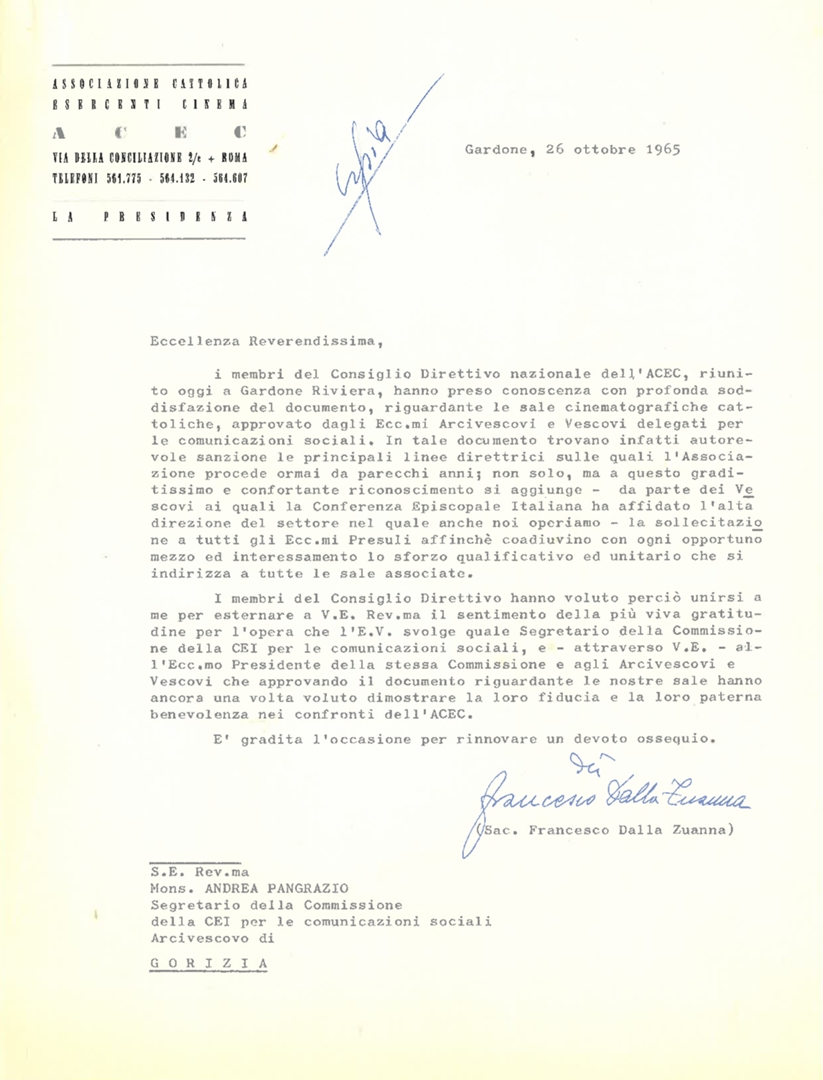 Lettera di mons. Andrea Pangrazio, segretario della Commissione episcopale per le comunicazioni sociali, arcivescovo di Gorizia e Gradisca, a mons. Francesco Dalla Zuanna, presidente dell'ACEC