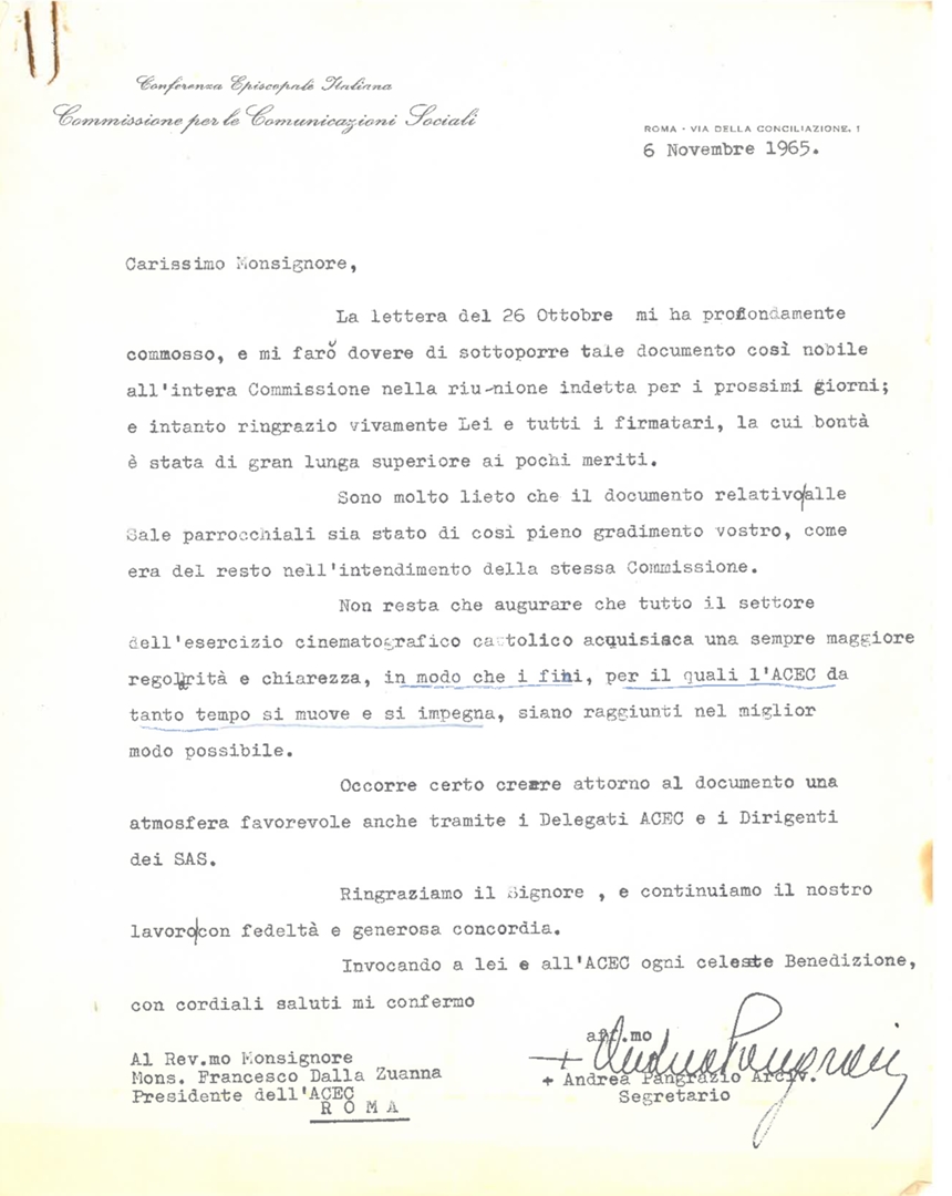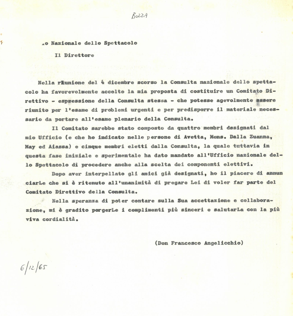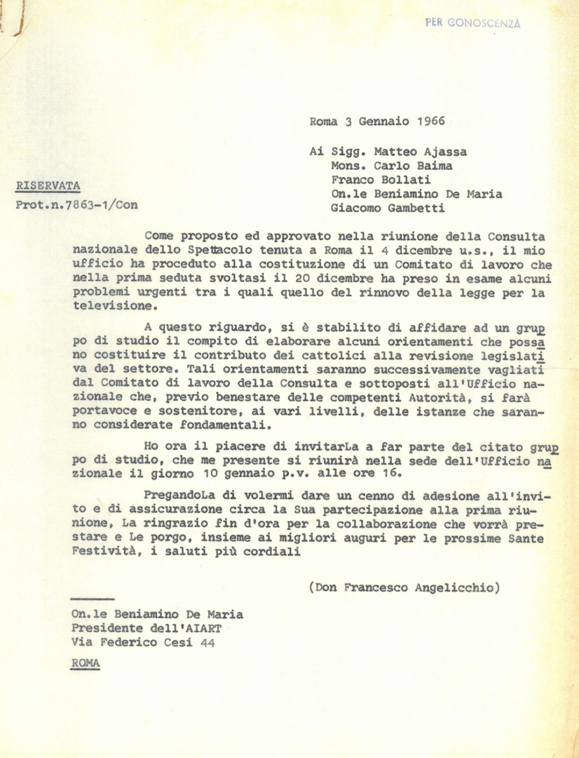 Lettera di don Francesco Angelicchio, direttore dell'Ufficio nazionale dello spettacolo, all'on. Beniamino De Maria, presidente dell'Associazione italiana ascoltatori radio e televisione - AIART, e a Matteo Ajassa, Carlo Baima, Franco Bollati, Giacomo Gambetti