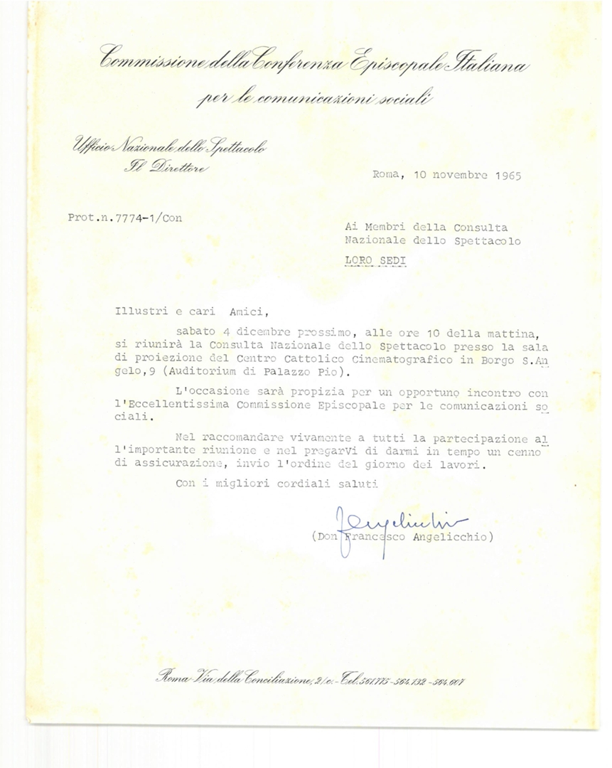 Lettera di don Francesco Angelicchio, direttore dell'Ufficio Nazionale dello Spettacolo della Commissione della Conferenza Episcopale Italiana per le comunicazioni sociali, a destinatario non indicato