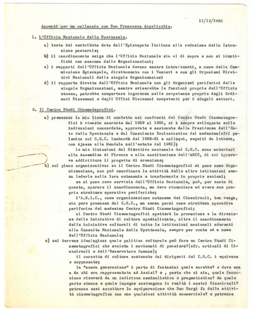 Lettera di don Francesco Angelicchio, direttore dell'Ufficio nazionale dello spettacolo, a destinatario non indicato
