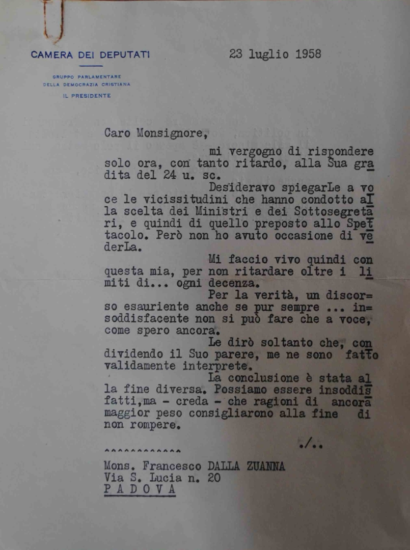 Lettera di Luigi Gui a mons. Francesco Dalla Zuanna