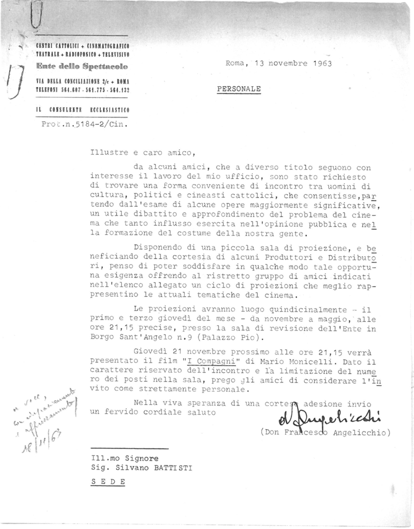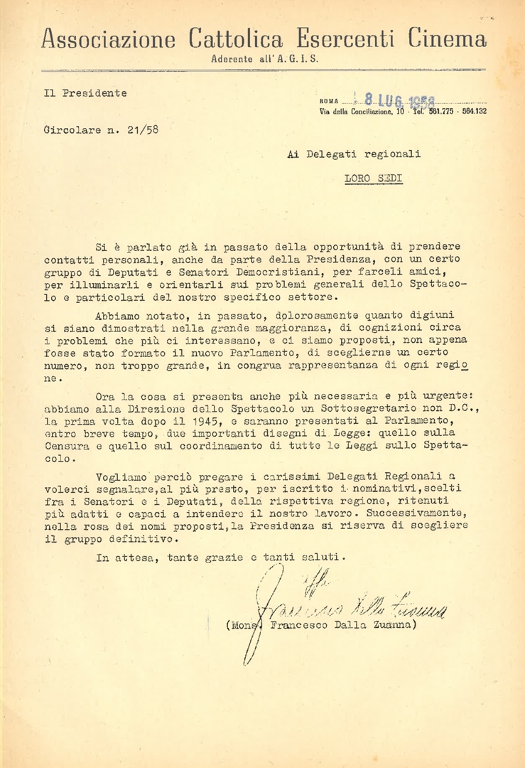 Lettera riservata a firma di don Francesco Angelicchio, consulente ecclesiastico del Centro cattolico cinematografico - CCC, e di mons. Francesco Dalla Zuanna, presidente dell'ACEC