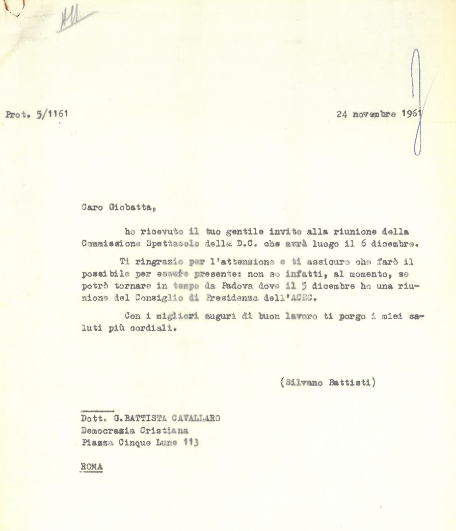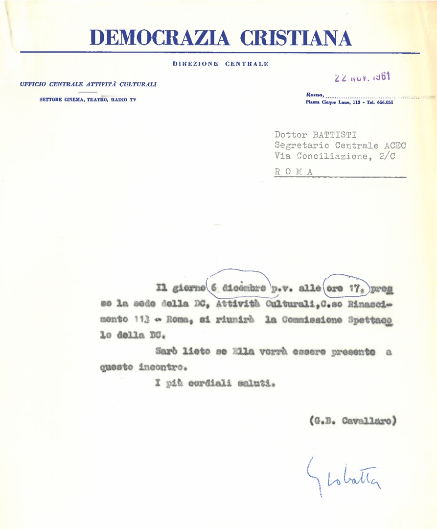 Lettera di Giovanni Battista Cavallaro, dell'Ufficio centrale attività culturali della Democrazia Cristiana, a Silvano Battisti, segretario generale dell'ACEC