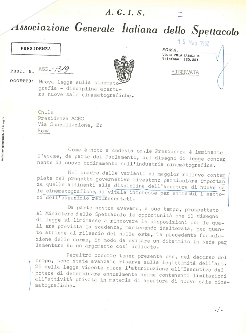 Lettera di Italo Gemini, presidente dell'Associazione generale italiana dello spettacolo - AGIS, alla Presidenza dell'ACEC