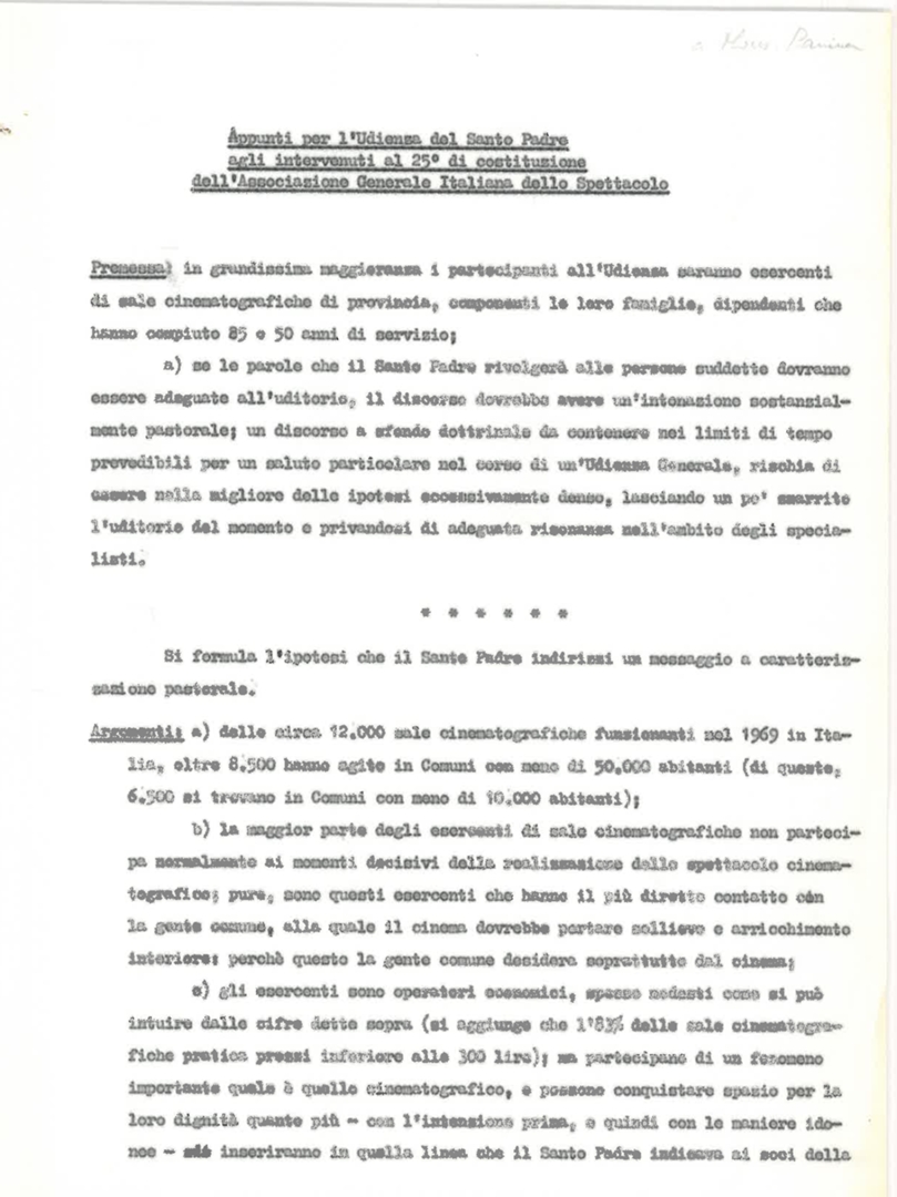 "Appunti per l'udienza del Santo Padre agli intervenuti al 25° di costituzione dell'Associazione generale italiana dello spettacolo"
