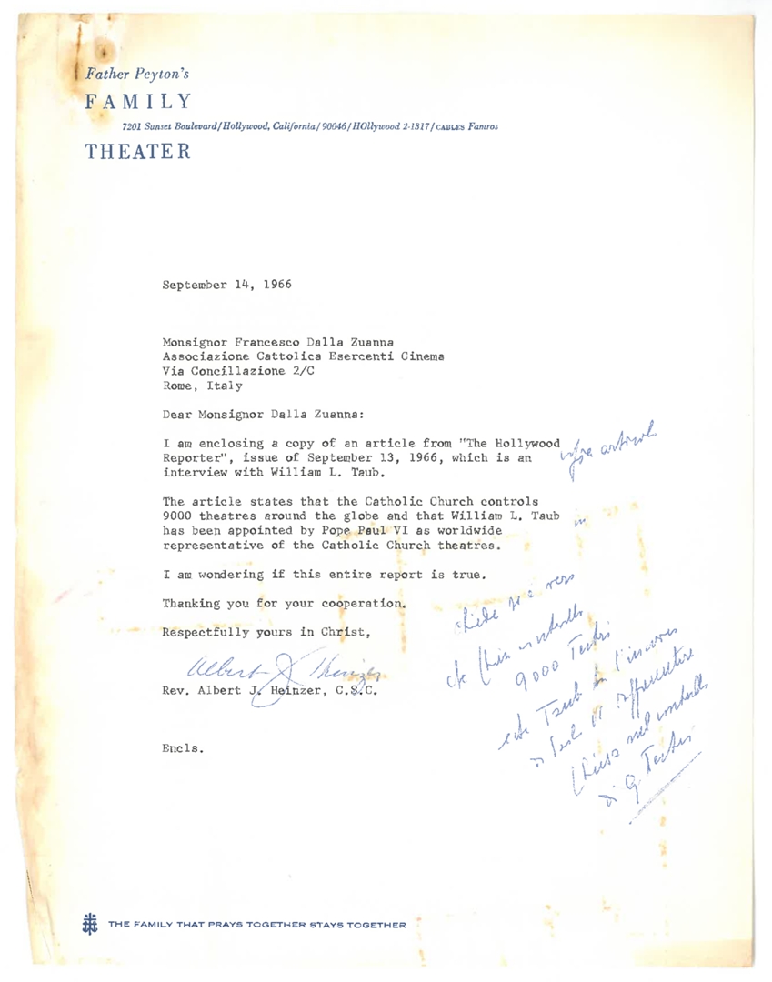 Lettera di padre Albert J. Heinzer a mons. Francesco Dalla Zuanna, presidente dell'ACEC