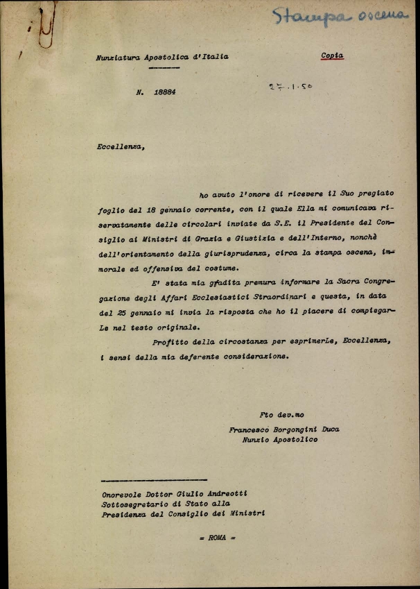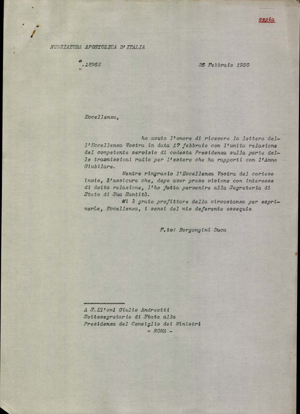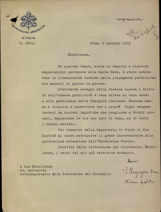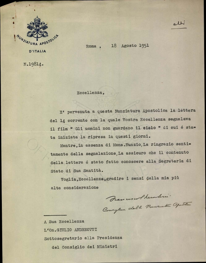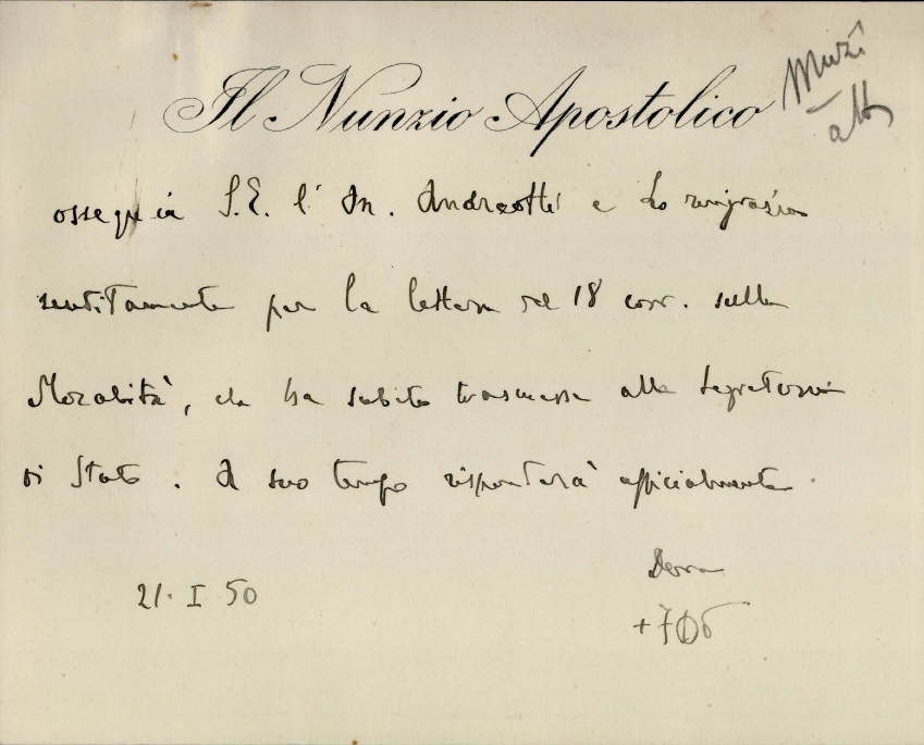 Lettera della Nunziatura apostolica d'Italia all'on. Giulio Andreotti, sottosegretario di Stato alla presidenza del consiglio dei ministri