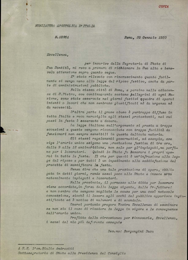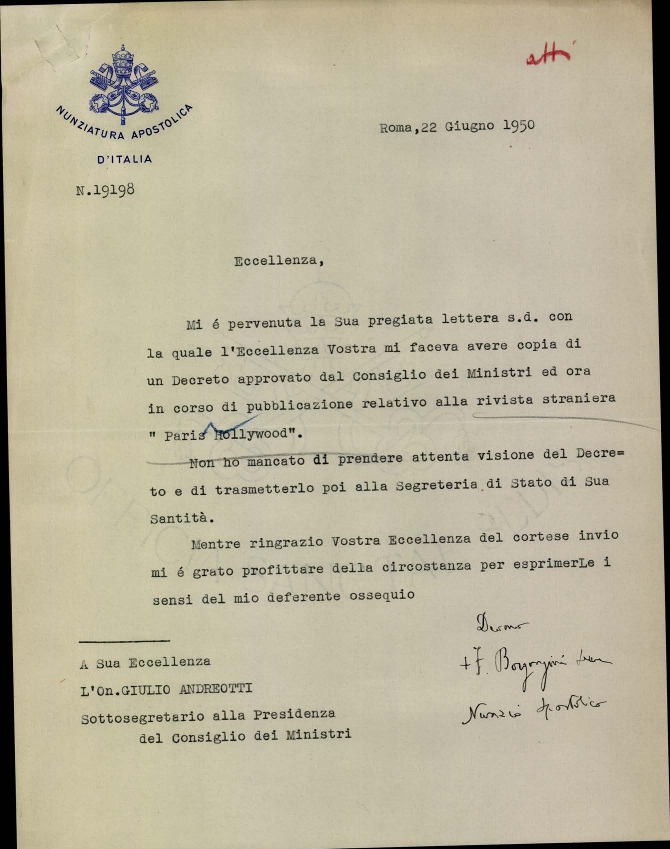 Lettera del nunzio apostolico Francesco Borgongini Duca all'on. Giulio Andreotti, sottosegretario di Stato alla presidenza del consiglio