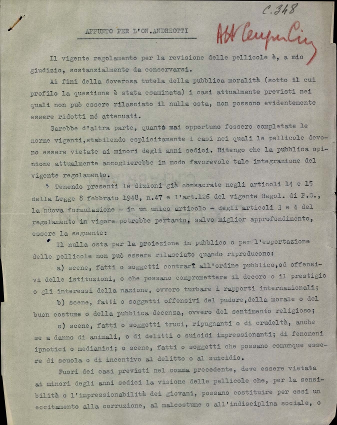 "Appunto per l'on. Andreotti", a firma di Gino Gavuzzo, direttore del segretariato per la moralità