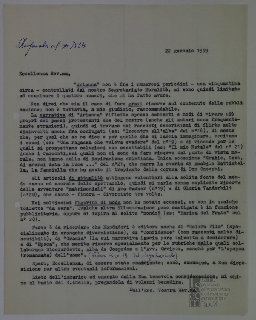 Lettera di mons. Ferdinando Prosperini a mons. Angelo Dell'Acqua, sostituto per gli affari generali della Segreteria di stato della Santa Sede.
