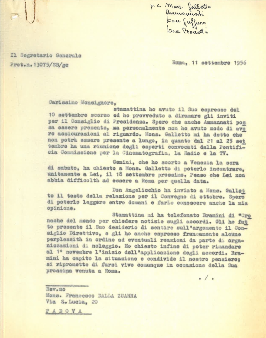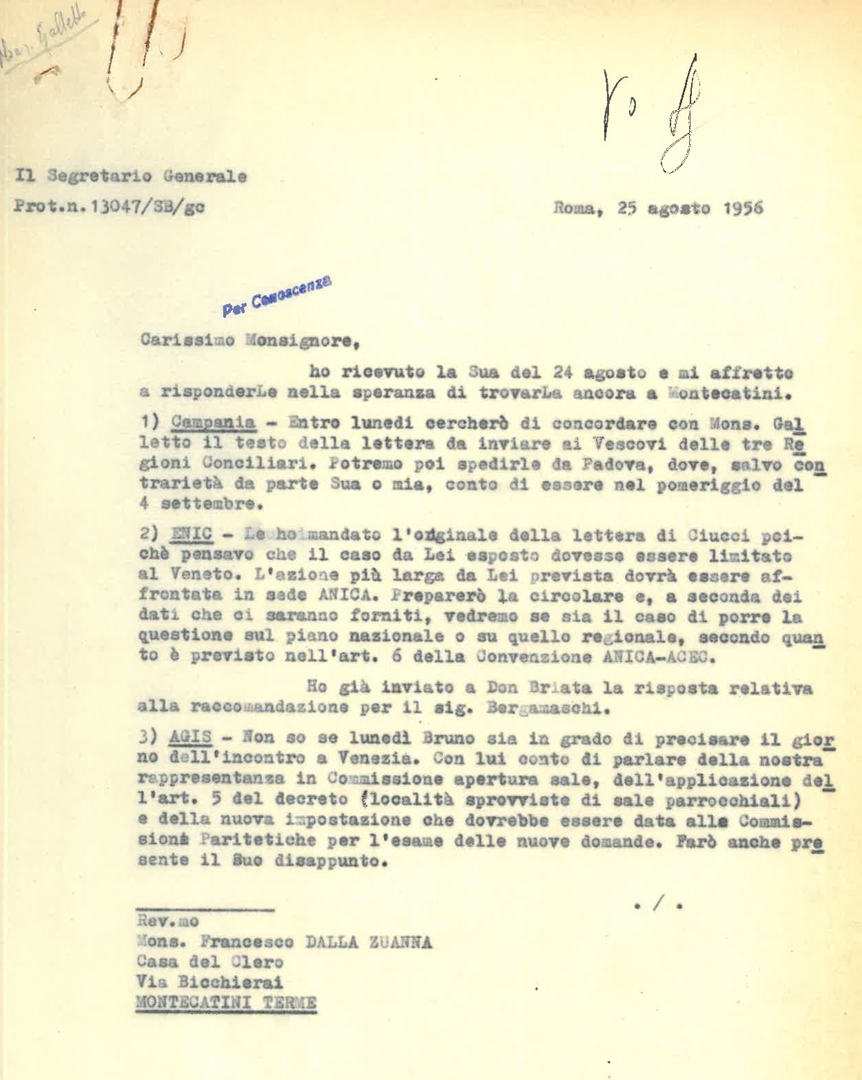Lettera di mons. Francesco Dalla Zuanna, presidente dell'ACEC, a Silvano Battisti, segretario generale dell'ACEC