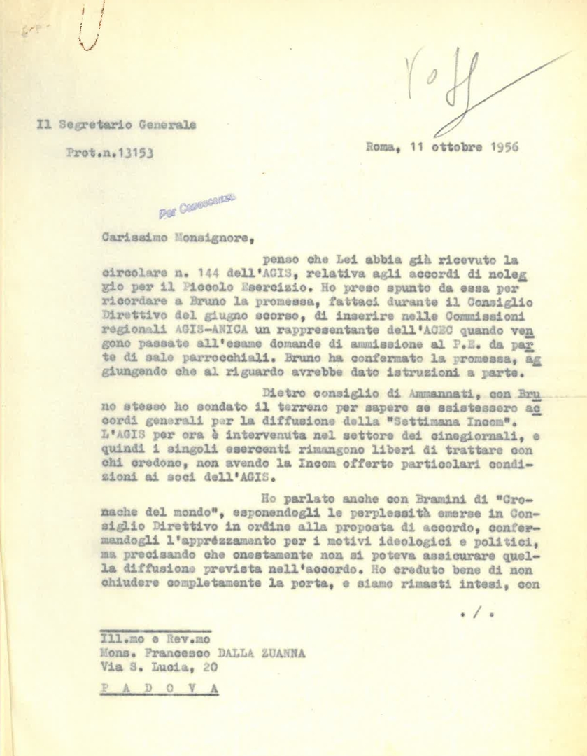 Lettera di Silvano Battisti, segretario generale dell'ACEC, a mons. Francesco Dalla Zuanna, presidente dell'ACEC
