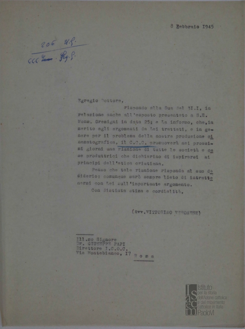 Lettera di Giuseppe Papi, direttore amministrativo della società cooperativa Italiana cattolica operaia cinematografica - ICOC, a Vittorino Veronese, segretario generale dell'ACI