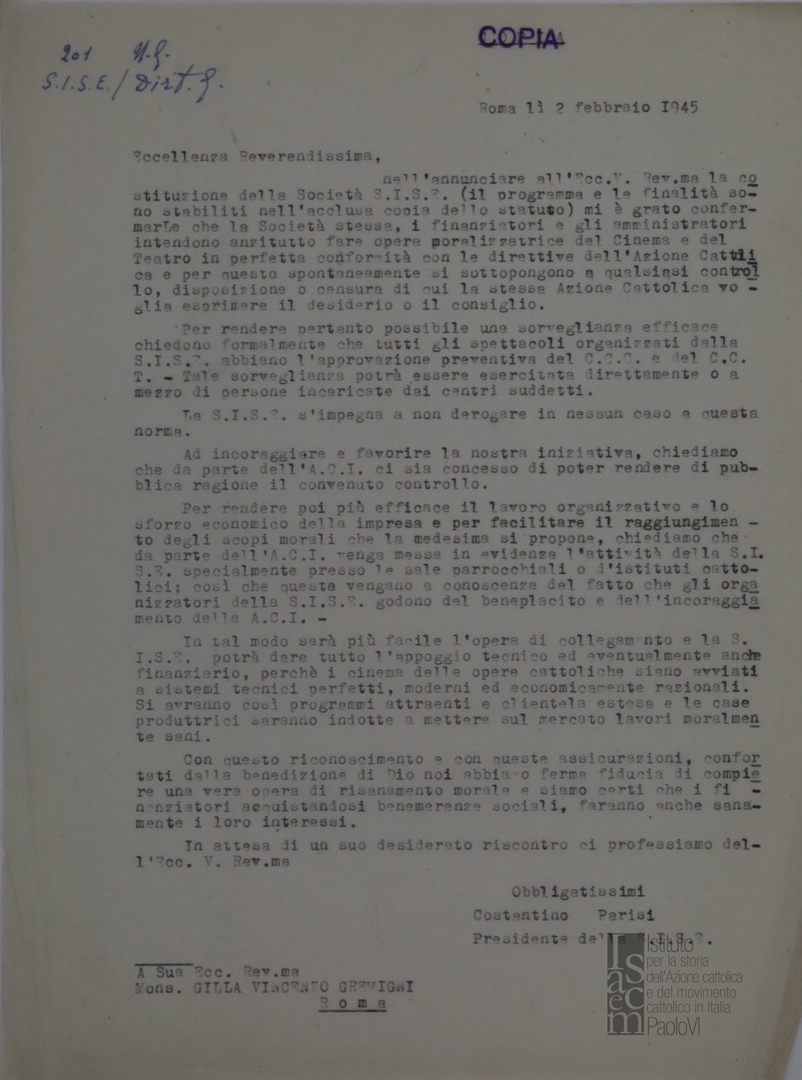 Lettera di Costantino Parise, presidente della Società italiana spettacoli educativi - SISE, a mons. Gilla Vincenzo Gremigni, direttore generale dell'ACI