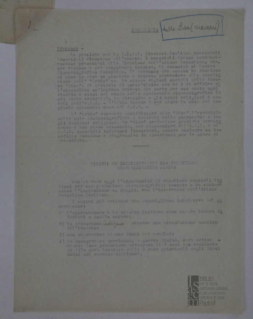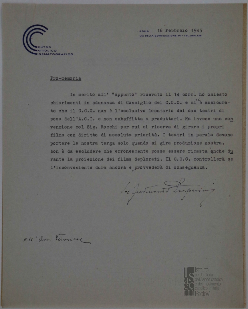 Promemoria di Ferdinando Prosperini, consulente ecclesiastico dell'Ente dello spettacolo, per Vittorino Veronese, segretario generale dell'ACI
