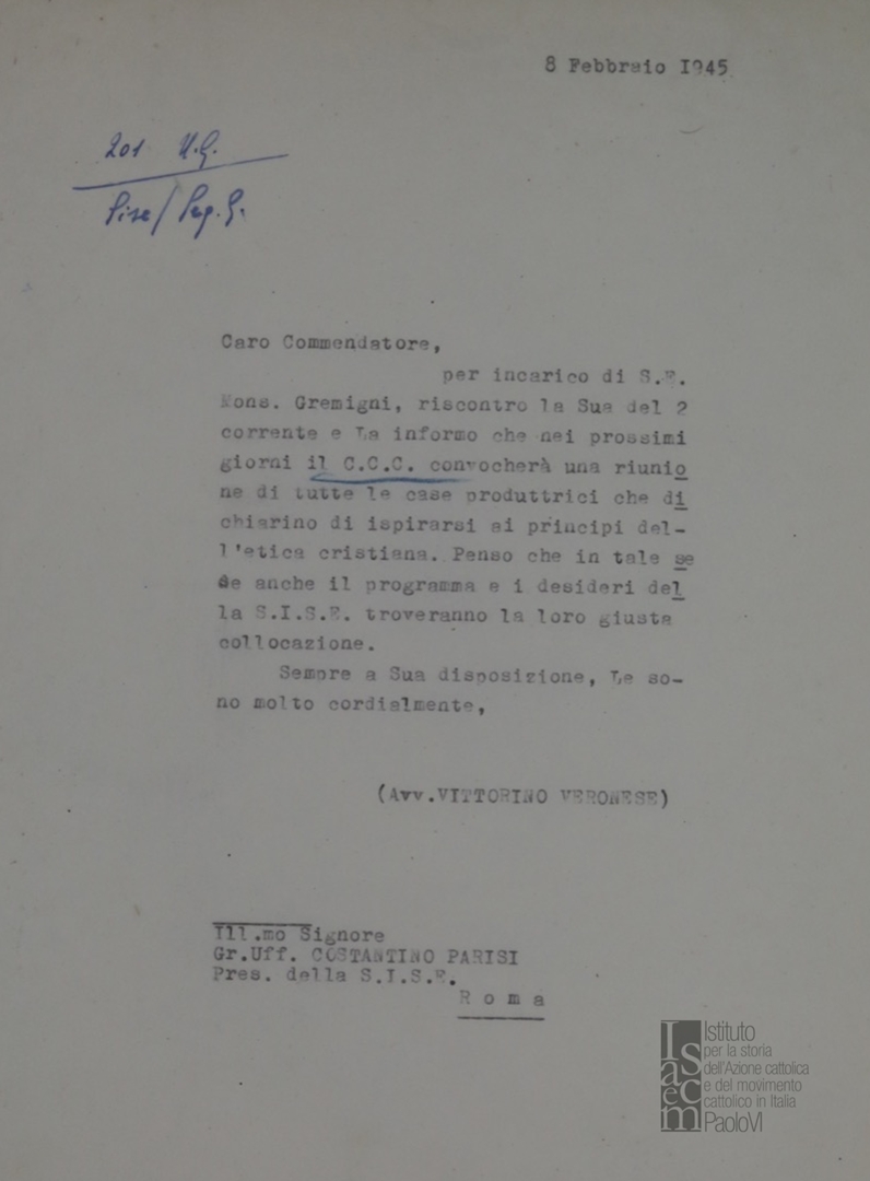 Lettera di Vittorino Veronese, segretario generale dell'ACI, a Giuseppe Papi, direttore amministrativo della società cooperativa Italiana cattolica operaia cinematografica - ICOC