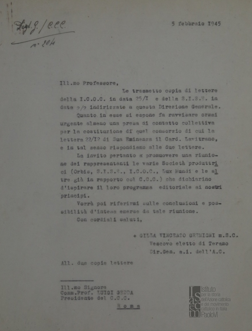 Lettera di mons. Gilla Vincenzo Gremigni, direttore generale dell'ACI, a Luigi Gedda, presidente del Centro cattolico cinematografico - CCC