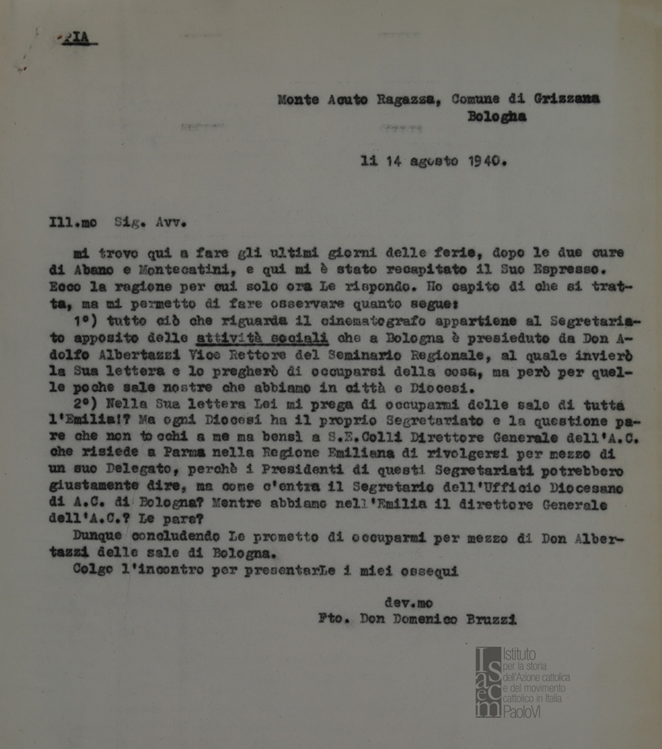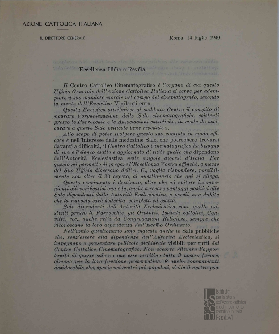 Lettera di mons. Domenico Bruzzi a Lamberto Vignoli, presidente del del Centro cattolico cinematografico - CCC