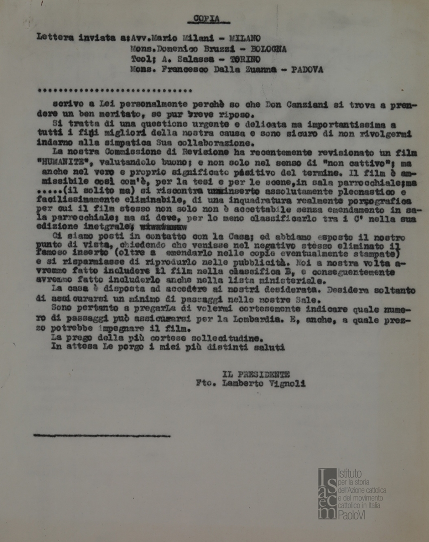 Lettera di Lamberto Vignoli, presidente del Centro cattolico cinematografico - CCC, all'avv. Mario Milani, a mons. Domenico Bruzzi, ad Angelo Salassa, a mons. Francesco Dalla Zuanna