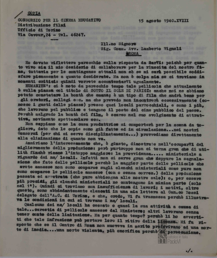 Lettera di Mario Milani, direttore del Consorzio per il cinema educativo, a Lamberto Vignoli, presidente del del Centro cattolico cinematografico - CCC