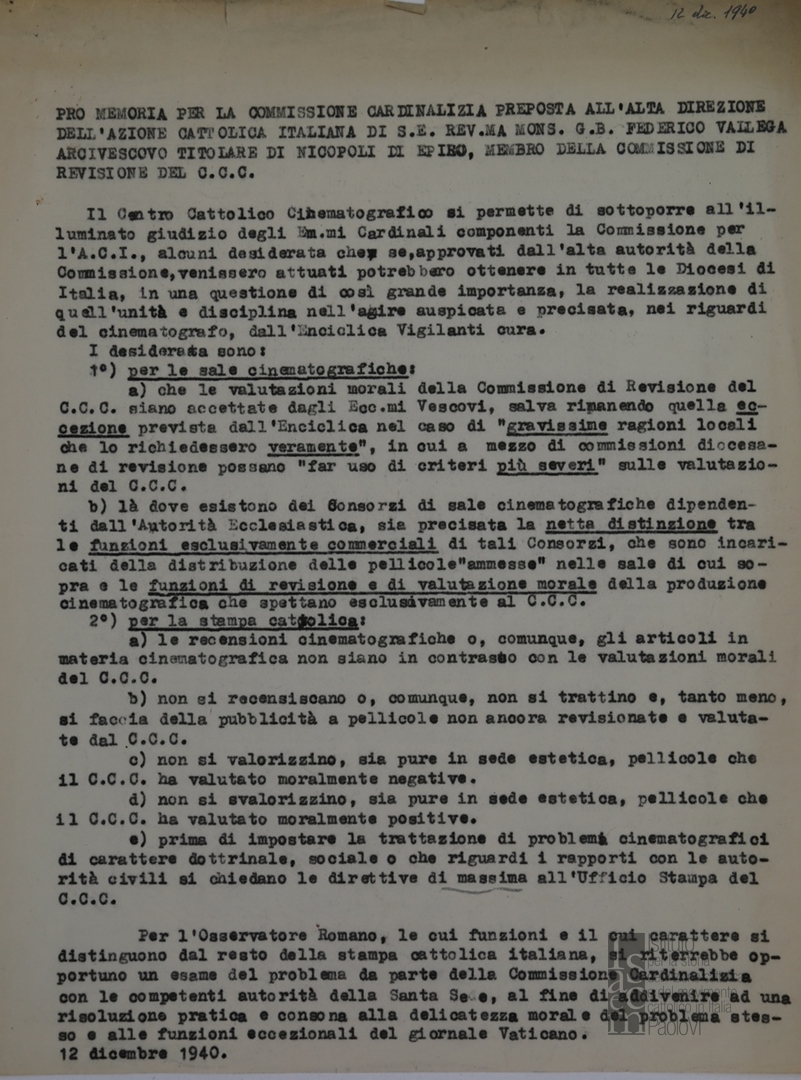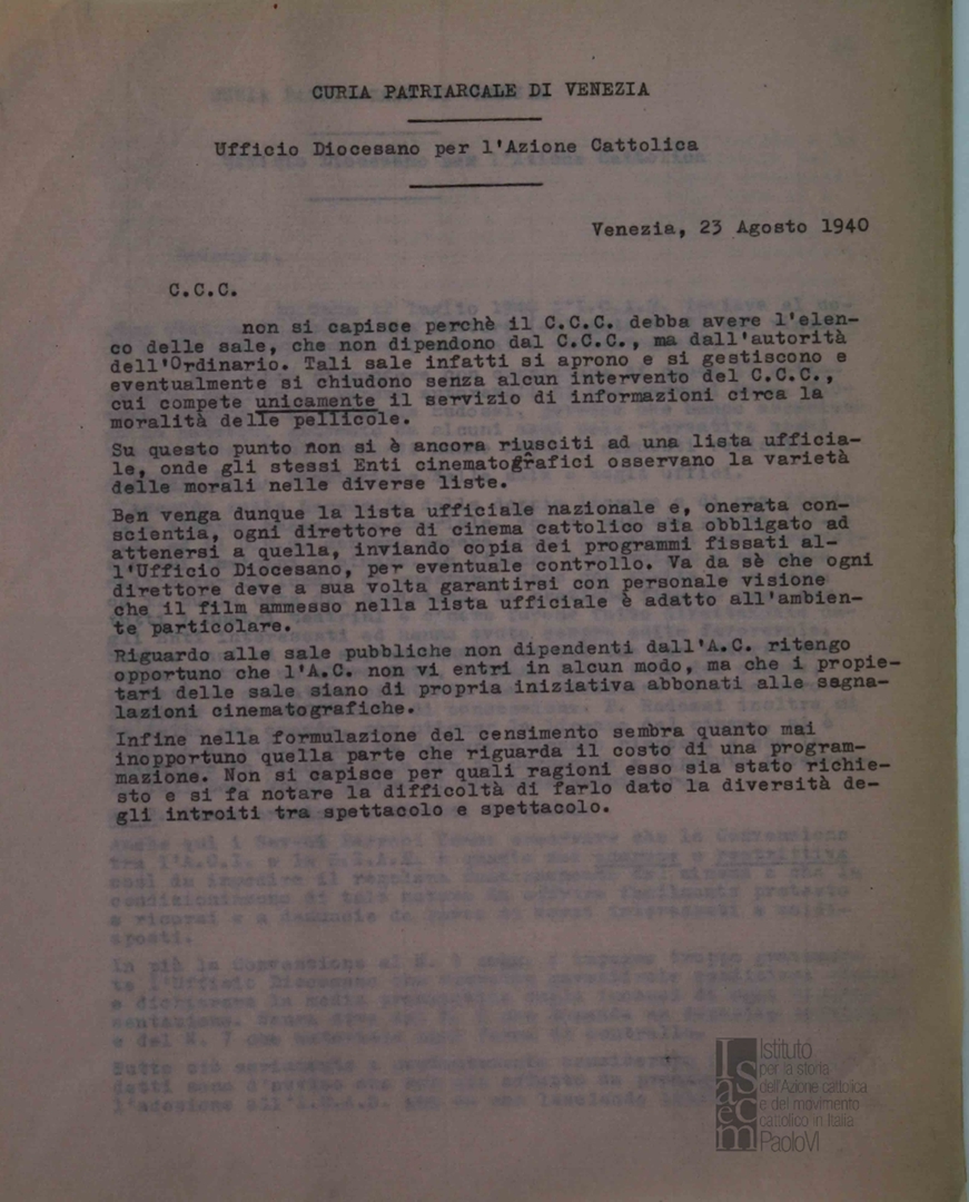 "Risposta agli appunti dell'Ufficio diocesano di Venezia in merito alla competenza e all'attività del Centro cattolico cinematografico"