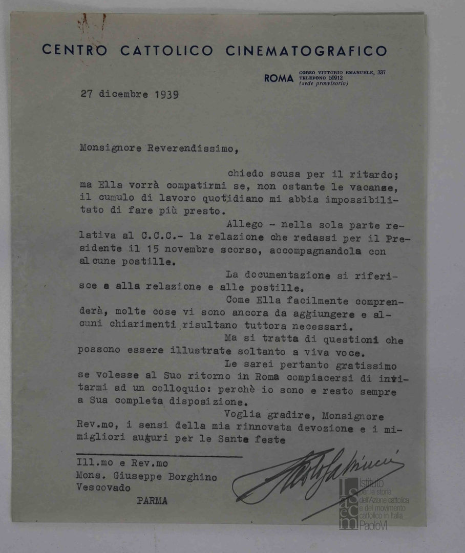Lettera di Paolo Salviucci del Centro cattolico cinematografico - CCC a mons. Giuseppe Borghino del vescovado di Parma