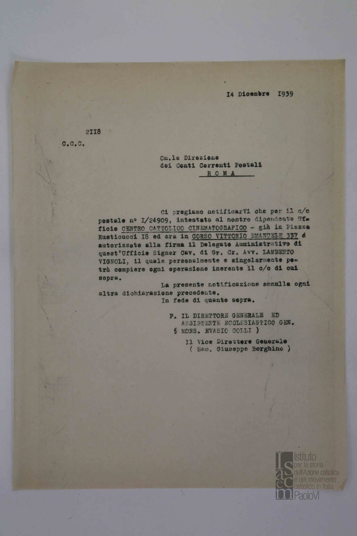 Lettera a firma di mons. Evasio Colli, direttore generale e assistente ecclesiastico generale del Centro cattolico cinematografico - CCC , e di don Giuseppe Borghino, vice direttore generale del Centro, alla Direzione dei conti correnti postali