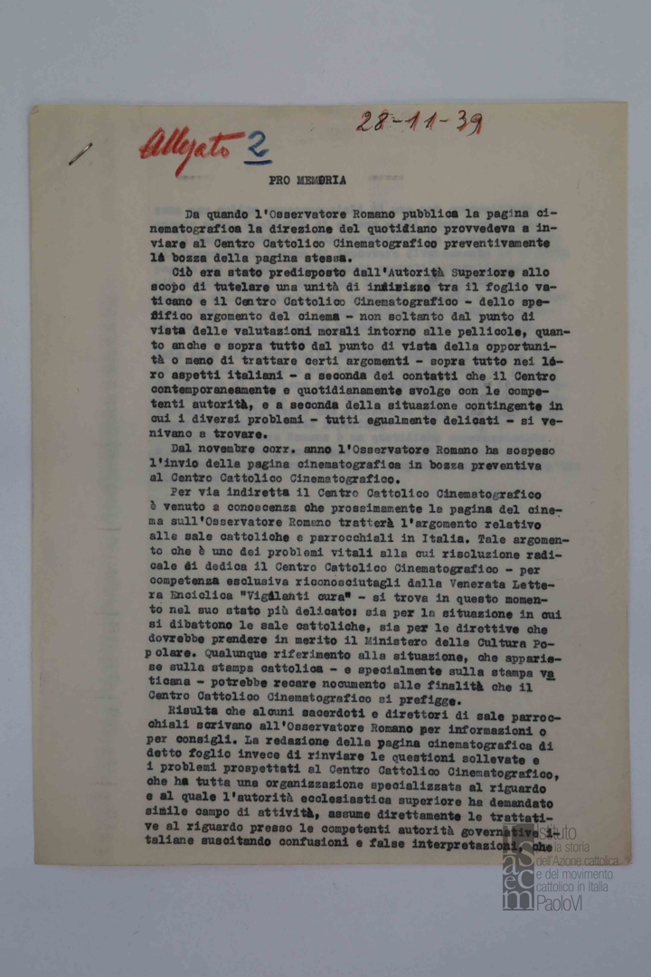 "Postille alla relazione del 15 novembre 1939 sul Centro cattolico cinematografico"