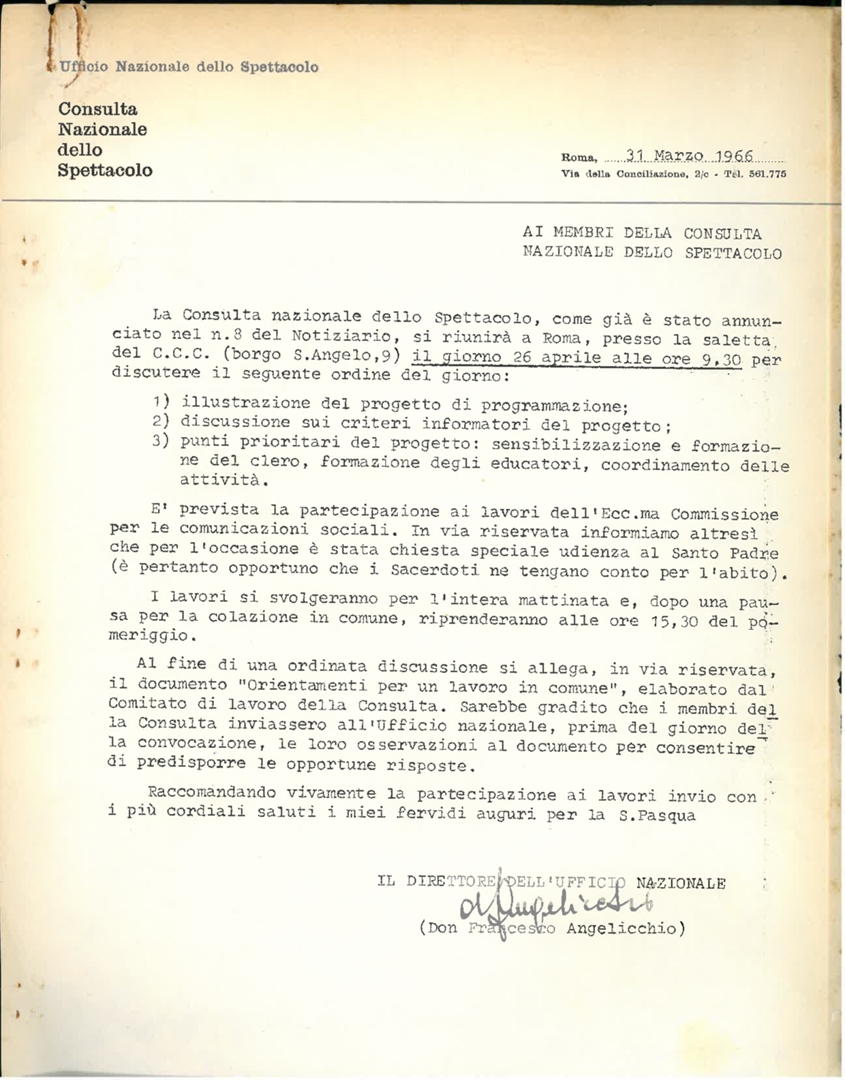 Lettera di don Francesco Angelicchio, direttore dell'Ufficio N azionale dello Spettacolo della Commissione della Conferenza Episcopale Italiana per le comunicazioni sociali, ai membri della Consulta nazionale dello spettacolo