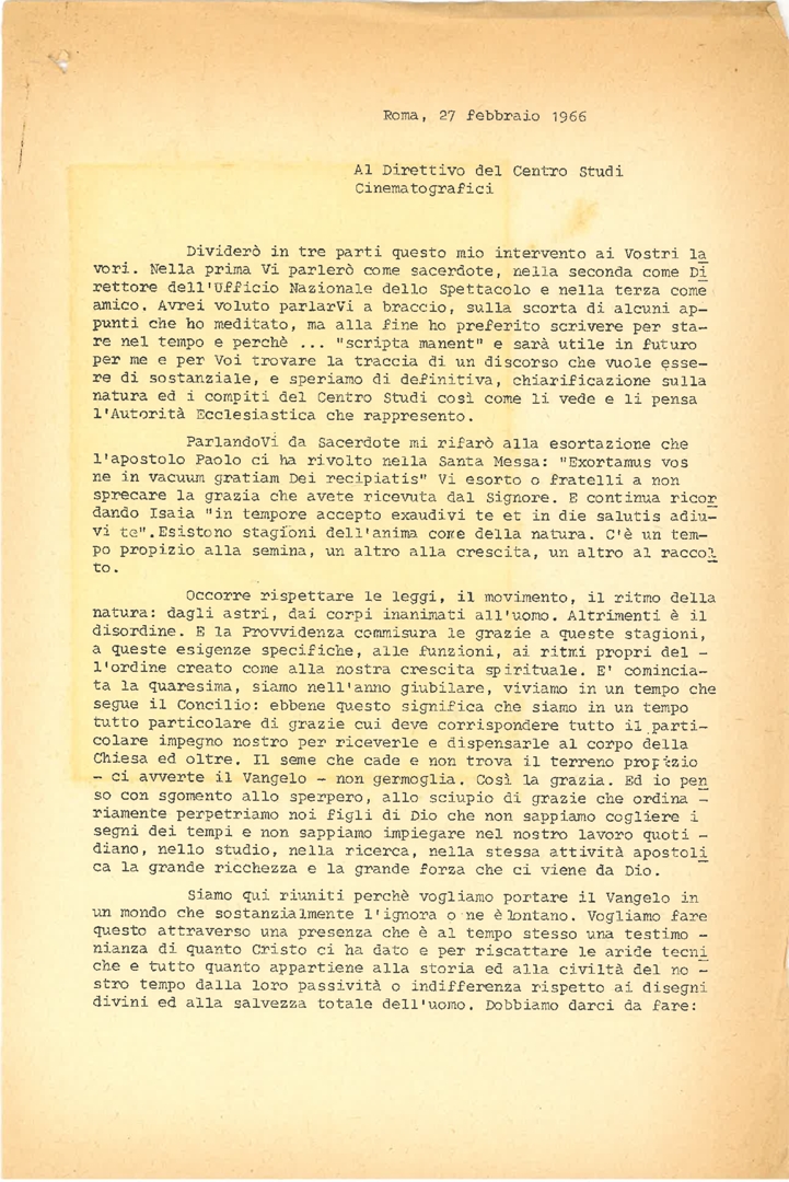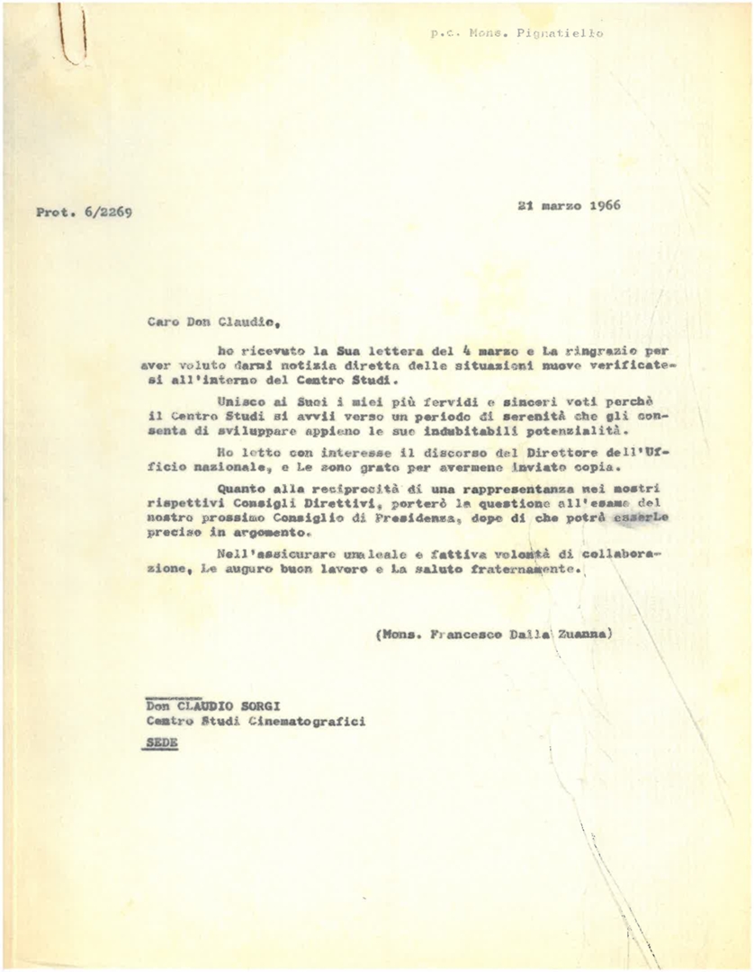 Lettera di don Claudio Sorgi, delegato ecclesiastico del Centro studi cinematografici - CSC, a mons. Francesco Dalla Zuanna, presidente dell'ACEC