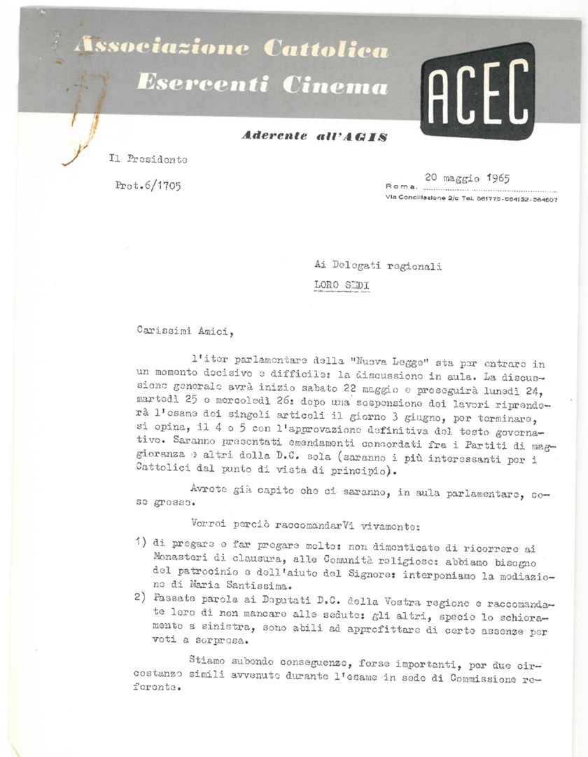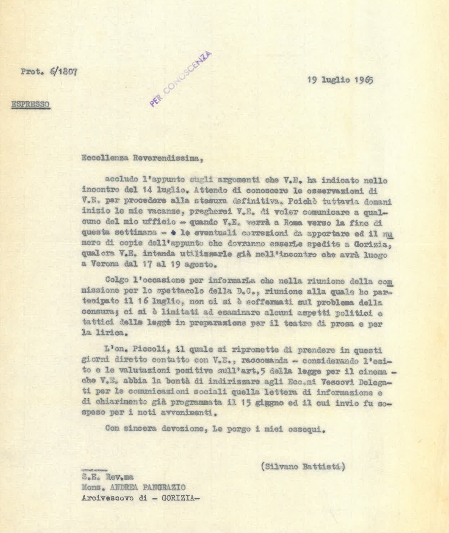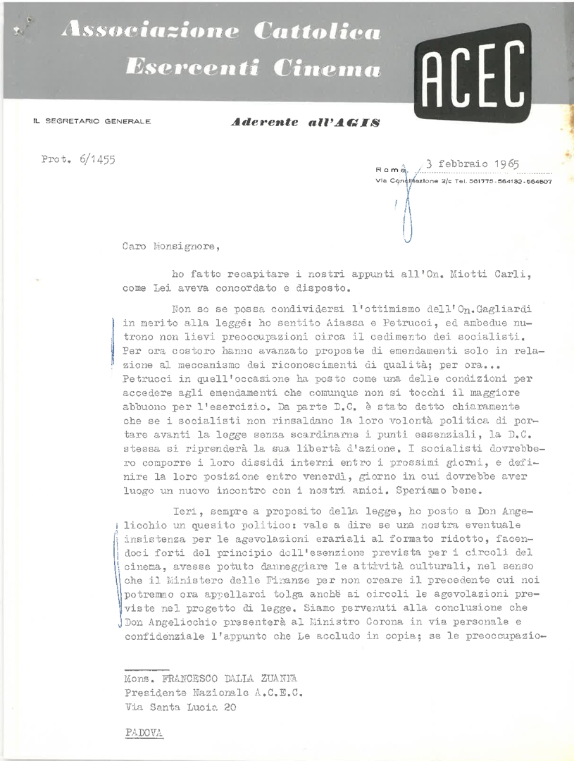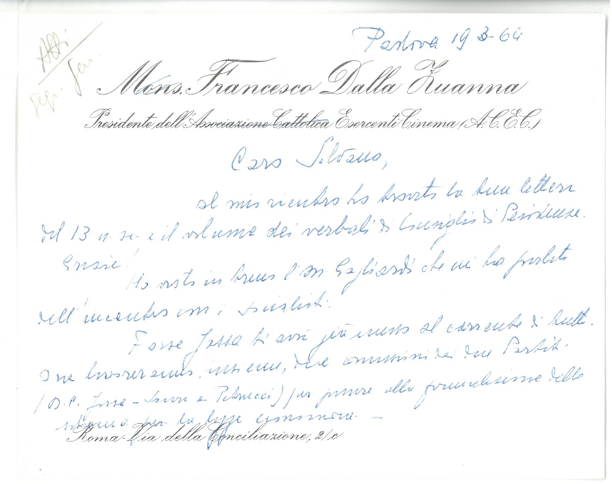 Lettera di don Francesco Angelicchio, consulente ecclesiastico dell'Ente dello spettacolo, a Silvano Battisti, segretario generale dell'ACEC