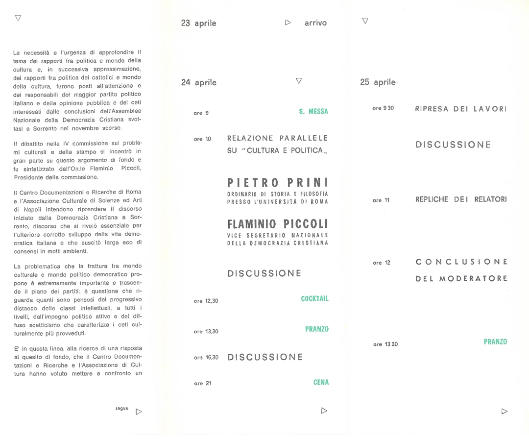 "Politica e cultura", incontro di studio promosso dal Centro di documentazione e ricerche di Roma e dall'Associazione culturale di scienze ed arti di Napoli, Castellammare Terme, 24 - 25 aprile 1966