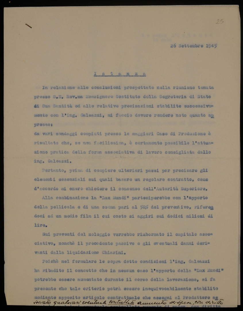 Scrittura privata tra la Pontificia commissione di assistenza, la società cooperativa Lux Mundi e l'ing. Enrico Pietro Galeazzi