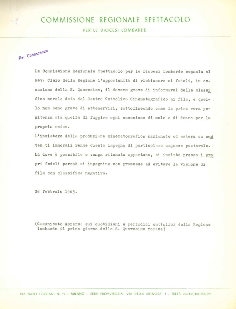 Comunicato della Commissione regionale spettacolo per le diocesi lombarde.