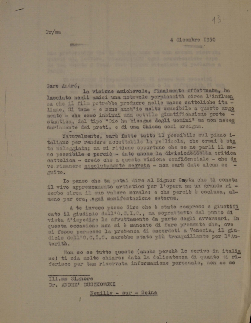 Lettera di André Ruszkowski, dirigente dell'OCIC, a Vittorino Veronese, presidente generale dell'ACI